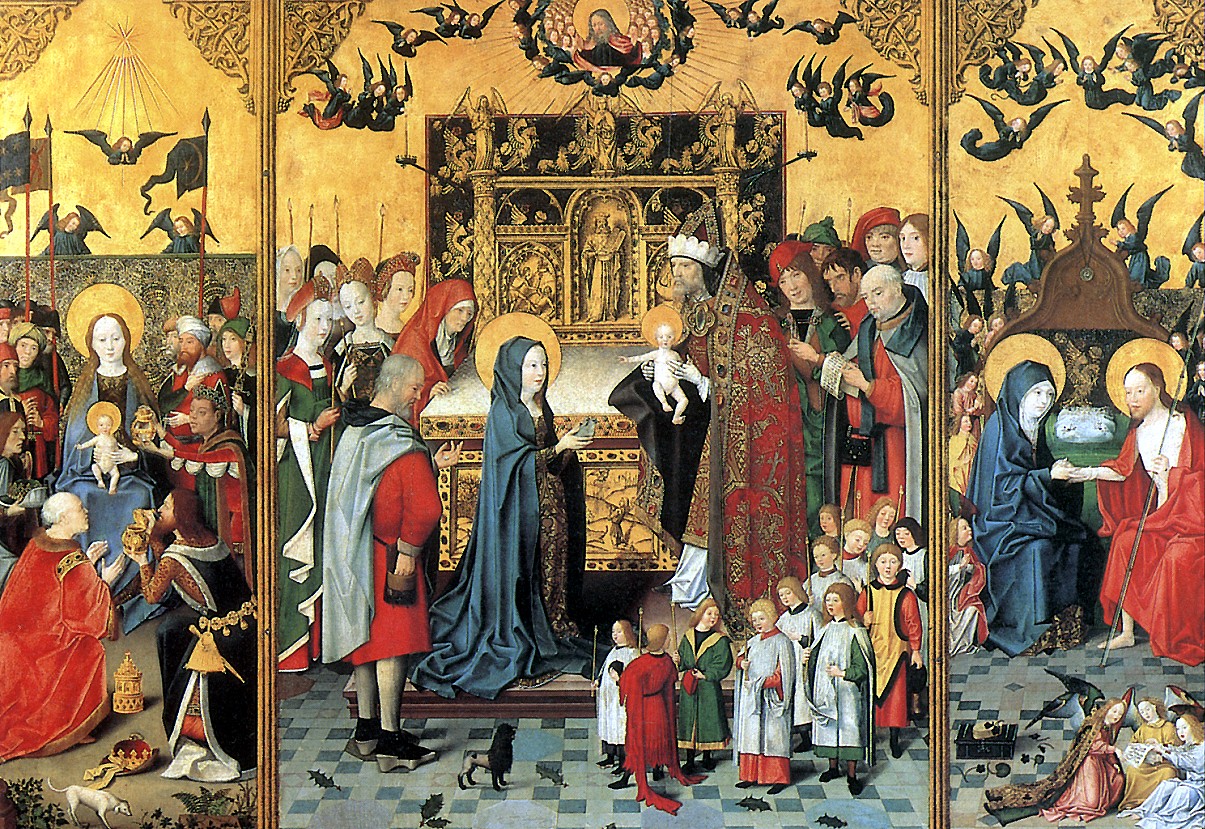 MASTER OF SAINT RELATIVES Altar of Seven pleasures of the Birth-Giver of God: A worship of the magic, Bringing to the temple, Christ is Maria. of Apprx. 148. Worked in Cologne in 147/8-1515 Wood, 127 x 182 cm. R.F came to Louvre in 1912. 245 (S/AR)