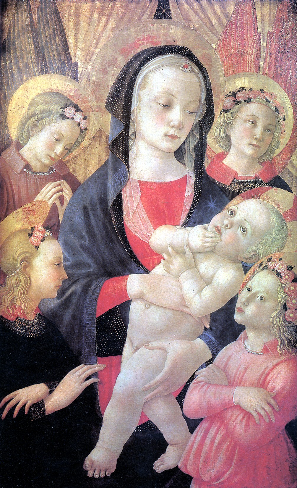 MASTER OF CHRISTMAS OF KASTELLO Madonna with the baby in a surrounding of four angels. Florence, apprx. 145 – apprx. 1475 Wood, 86 x 62 cm. R.F came to Louvre in 193. 156 (MN)