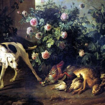 Still life with a dog and the beaten game at a pink bush, 1724.