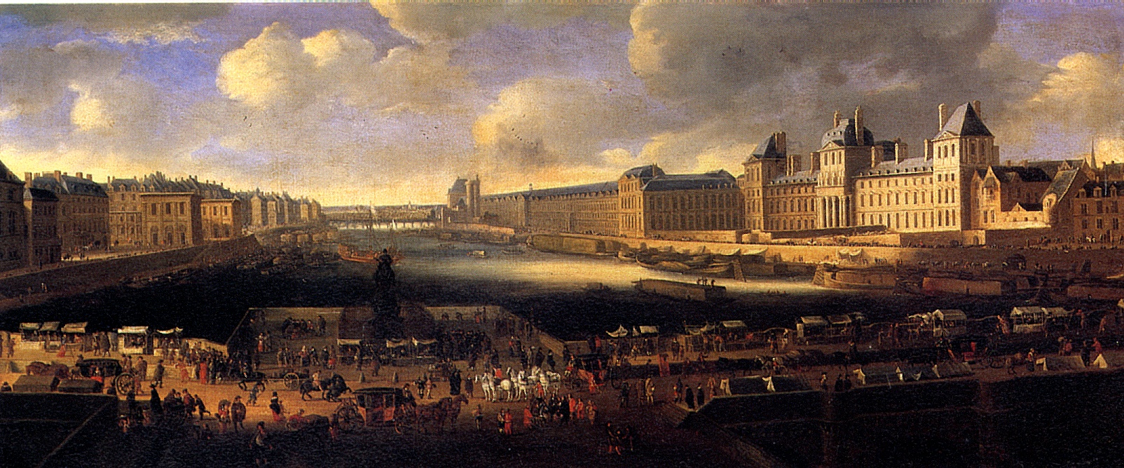 Panoram of Paris in the 17th century overlooking Louvre from the New bridge.